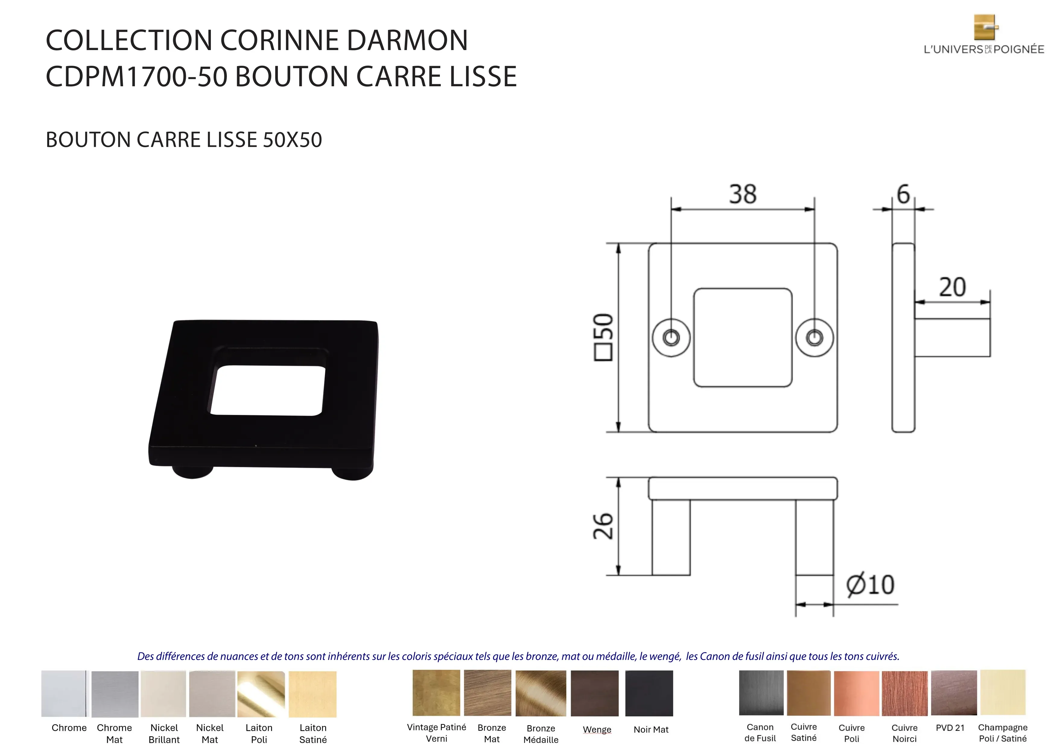 Laiton satiné ; Laiton poli ; Chrome mat ; Chrome brillant ; Nickel mat ; Nickel brillant ; Bronze mat ; Bronze médaille ; Bronze vintage ; Wengé ; Blanc ; Noir mat ; Canon de fusil ; Cuivre satiné ; Cuivre brillant ; Cuivre noirci ; Champagne mat ; Champagne brillant