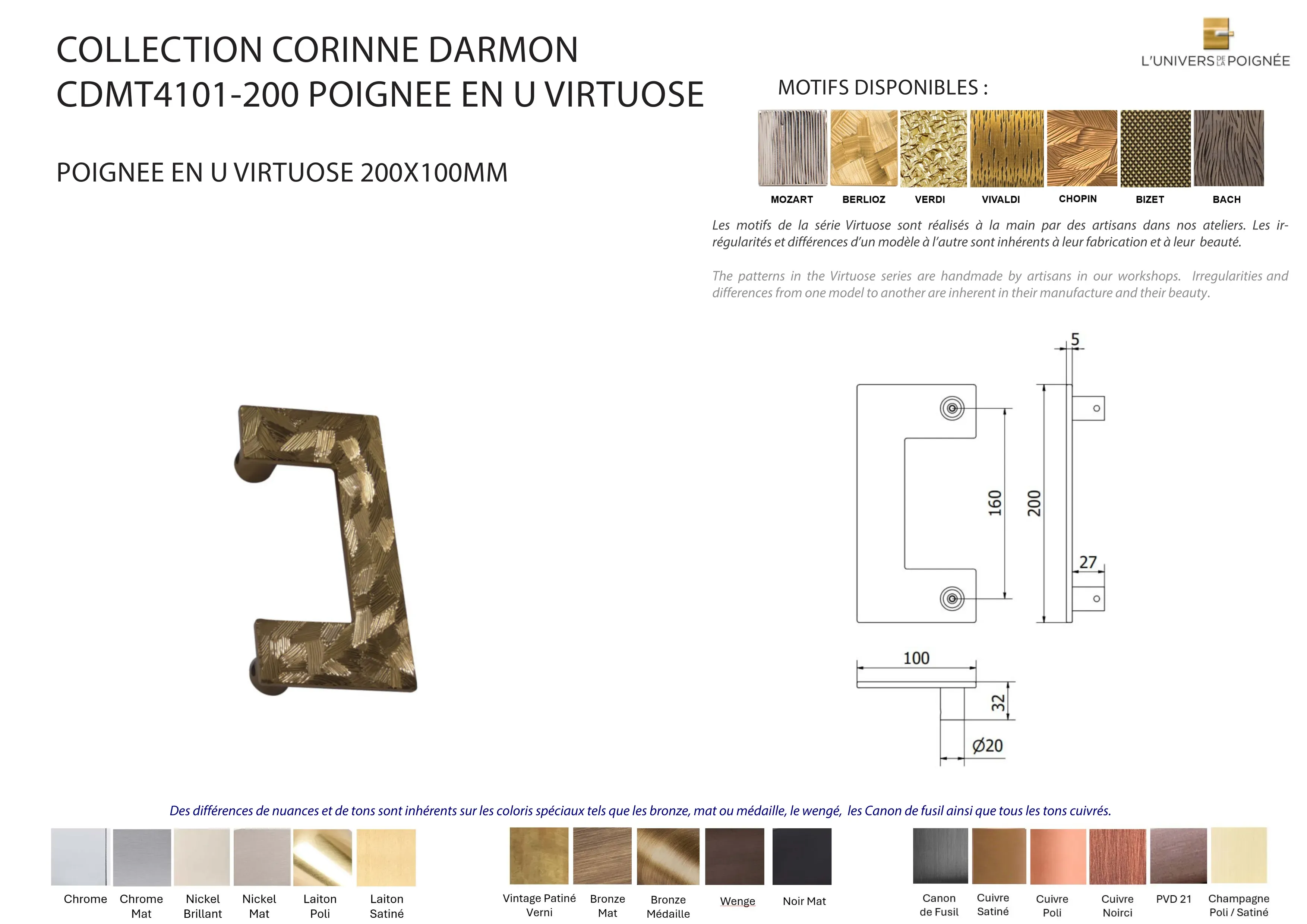 Parce que chaque détail compte, la poignée en U 200x100mm peut être entièrement personnalisée grâce à un travail artisanal minutieux de gravure. Son design peut être sublimé par des motifs exclusifs de la collection Virtuose renforçant encore son allure décorative et raffinée.