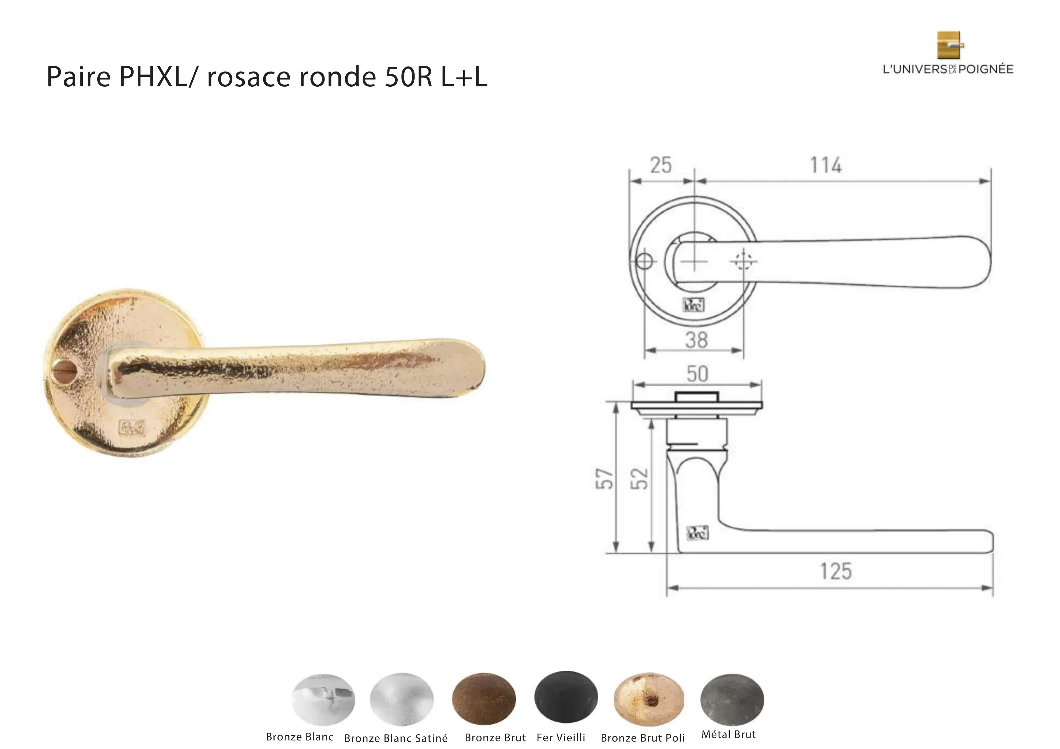 Disponible en 6 finitions possibles, cette collection s’adapte à divers styles et ambiances, offrant une touche de raffinement et de modernité à chaque pièce : Fer vieilli ; Métal brut ; Bronze blanc ; Bronze blanc satiné ; Bronze brut ; Bronze brut poli